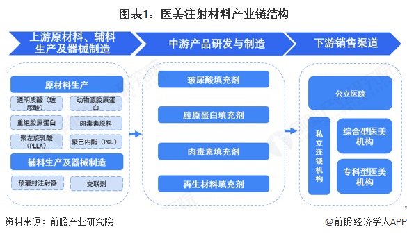 医美注射材料上游上游原材料、辅料生产及器械制造包括:透明质酸(玻尿酸)、重组胶原蛋白、聚左旋乳酸(PLLA)、动物源胶原蛋、肉毒素原料、聚己内酯(PCL)、预灌封注射器、交联剂等;中游产品研发与制造包括玻尿酸填充剂、胶原蛋白填充剂、肉毒素填充剂、再生材料填充剂等;下游销售渠道包括公立医院和私立连锁结构。