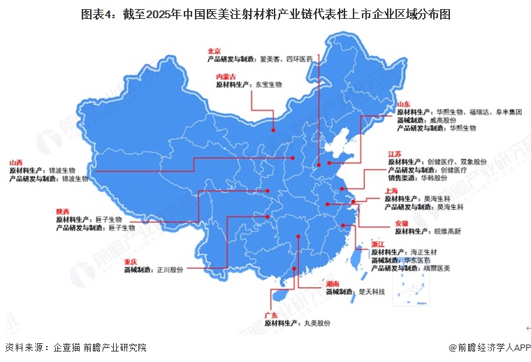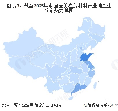 我国医美注射材料产业链上的企业主要集中在山东省地区,其次是在广东省、江苏省、上海市、浙江省以及北京市等地区。