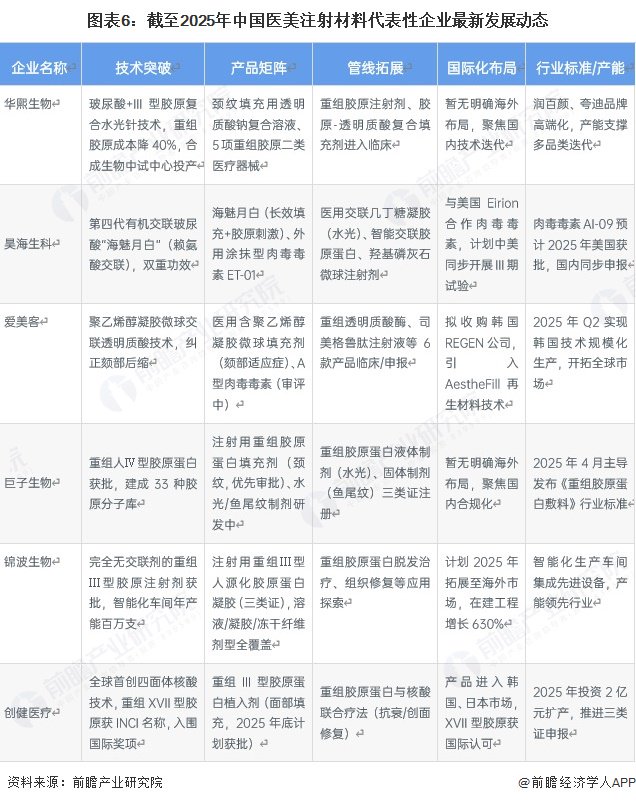华熙生物、昊海生科等六家企业在医美注射材料领域加速布局:华熙生物、昊海生科聚焦玻尿酸技术迭代(如复合配方、有机交联),爱美客推进多元化产品(含肉毒毒素、再生材料),巨子生物、锦波生物、创健医疗则以重组胶原蛋白为核心,分别在Ⅲ型/Ⅳ型/ⅩⅦ型胶原的注射剂研发、产能建设及国际化应用上突破,同时行业加速三类证审批与标准制定,技术竞争与合规化成为核心趋势。
