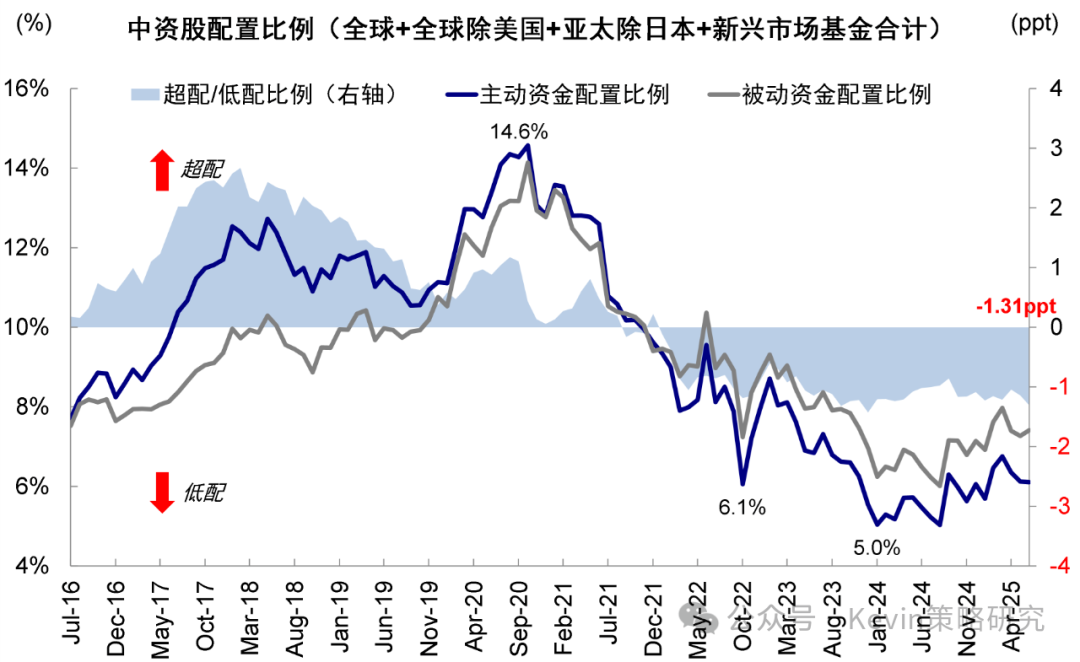 从下图中看,一是主动资金仍低配2.6%,二是被动资金仍低配1.8%,目前中资股仍是外资最低配的主要市场中的股票。