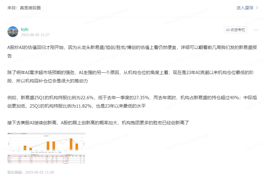 例如,我们在知识星球中4月份以来就持续跟踪新易盛、中际旭创、长芯博创和长飞光纤被明显低估的机会,自我们跟踪以来,这几家AI硬件公司都有很强的表现,明年的利润预期不断上修,处在越买越便宜的阶段。