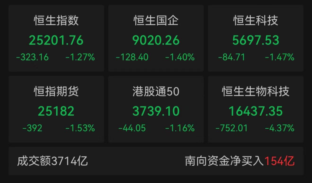 8月27日,港股三大指数高开低走。截至收盘,恒生指数下跌1.27%,报收于25201.76点,恒生科技指数下跌1.47%,国企指数下跌1.40%;南向资金净买入额约为154亿港元。