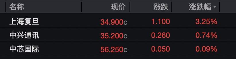上海复旦上涨3.25%,中兴通讯和中芯国际分别上涨0.74%、0.09%。