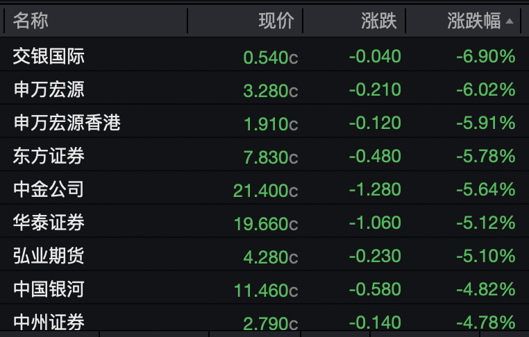 申万宏源、东方证券和中金公司分别下跌6.02%、5.78%和5.64%。