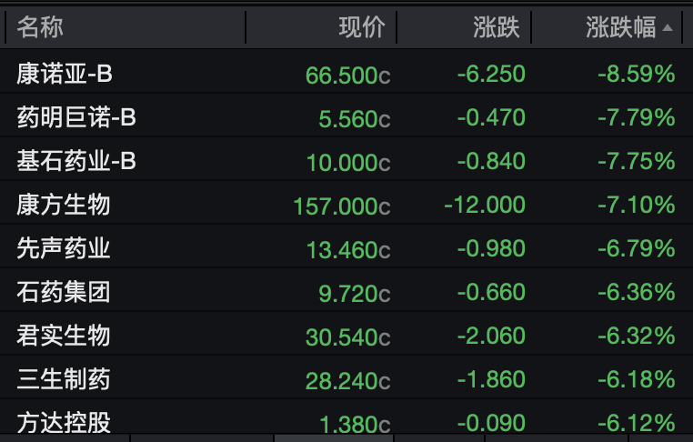B类股康诺亚、药明巨诺和基石药业分别下跌8.59%、7.79%和7.75%。