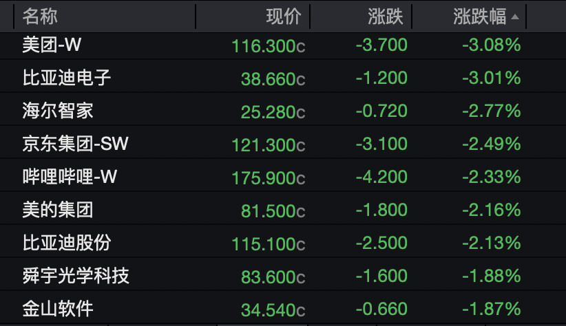 美团、比亚迪电子跌超3%,哔哩哔哩、京东集团和金山软件等均下跌。