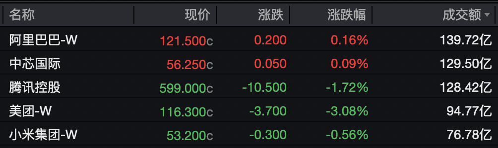 阿里巴巴成交139.72亿港元,上涨0.16%;中芯国际成交129.50亿港元,上涨0.09%;腾讯控股成交128.42亿港元,下跌1.72%。