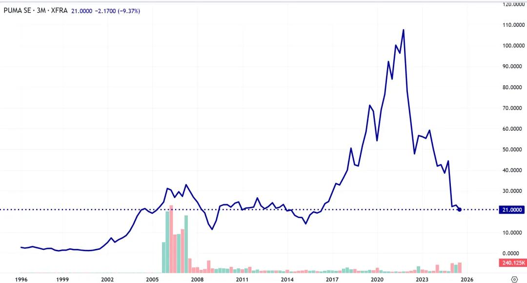 就连一些关键数据都像是回到10年前。就在上周,彪马股价曾跌至17欧元,创2016年以来新低。
