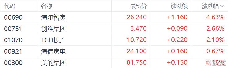 家电股普遍上涨,海尔智家涨4.63%,创维集团、TCL电子涨超2%。