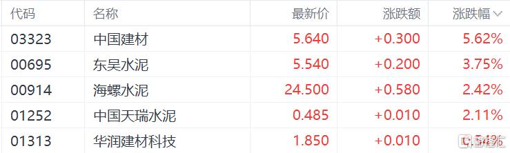 建材水泥股走高,中国建材涨5.62%,东吴水泥涨3.75%,海螺水泥、中国天瑞水泥、华润建材科技跟涨。