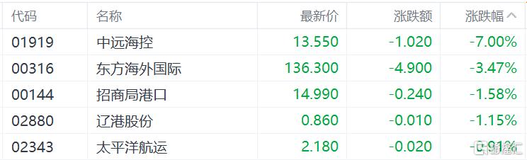 港口运输股跌幅靠前,中远海控跌7%,东方海外国际跌3.47%,招商局港口、辽港股份跌超1%。