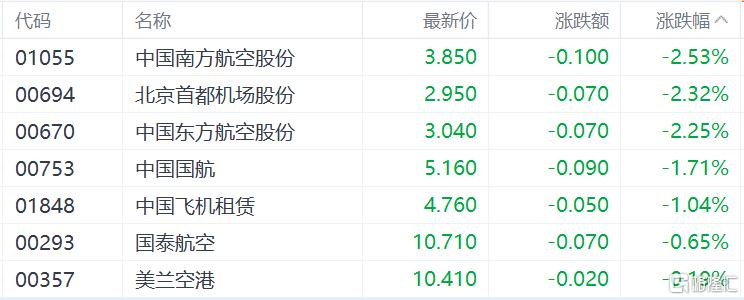航空股下跌,中国南方航空股份、北京首都机场股份、中国东方航空股份跌超2%,中国国航、国泰航空、美兰空港跟跌。