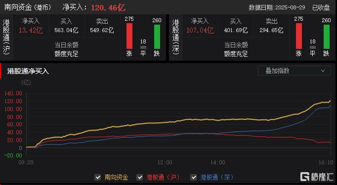 今日,南向资金净买入120.46亿港元,其中港股通(沪)净买入13.42亿港元,港股通(深)净买入107.04亿港元。
