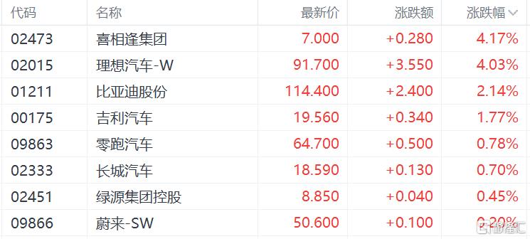 汽车股部分活跃,理想汽车涨超4%,比亚迪股份涨超2%,零跑汽车、吉利汽车、长城汽车、蔚来纷纷上涨。