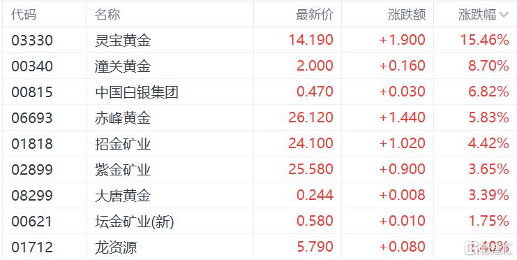 黄金股带领有色金属股大幅上涨,灵宝黄金涨15.46%领衔,潼关黄金涨8.7%,赤峰黄金涨5.83%,招金矿业涨4.42%,紫金矿业、大唐黄金涨超3%。