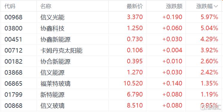光伏太阳能板块上扬,信义光能、协鑫科技涨超5%,协鑫新能源涨超4%,协合新能源、信义能源涨超2%。