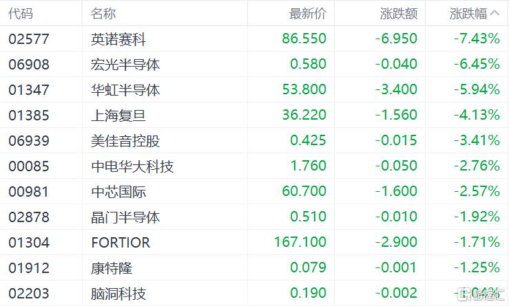 昨日大幅领涨的半导体芯片股集体走低,英诺赛科跌7.43%,宏光半导体跌6.45%,华虹半导体跌5.94%,上海复旦跌4.13%,中芯国际跌2.57%。