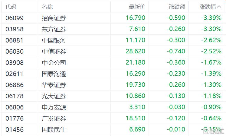 中资券商股多数低迷,招商证券、东方证券跌超3%,中国银河、中信证券跌超2%,中金公司、华泰证券、光大证券跟跌。