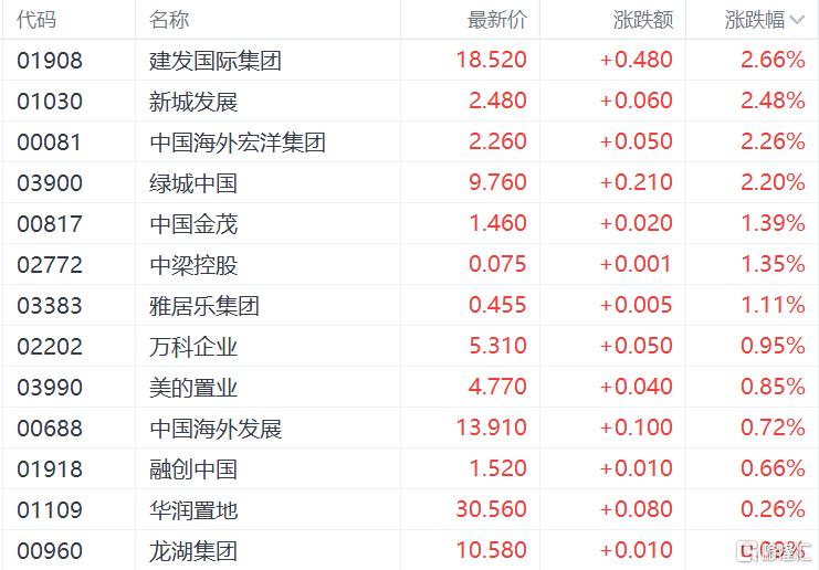 内房股与物管股携手上涨,其中,建发国际集团、新城发展、绿城中国涨超2%,中国金茂、中梁控股、雅居乐集团涨超1%。