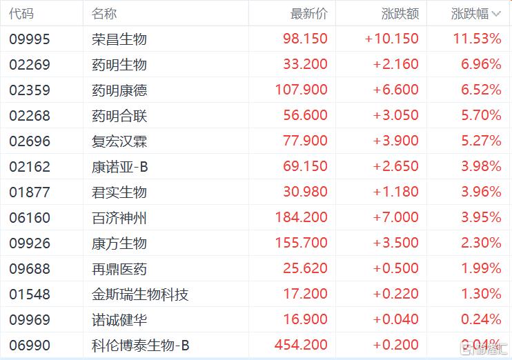 近日连续回调的生物医药股重拾升势,荣昌生物涨超11%,药明生物、药明康德涨超6%,药明合联、复宏汉霖涨超5%,康诺亚-B、君实生物、百济神州、再鼎医药等跟涨。
