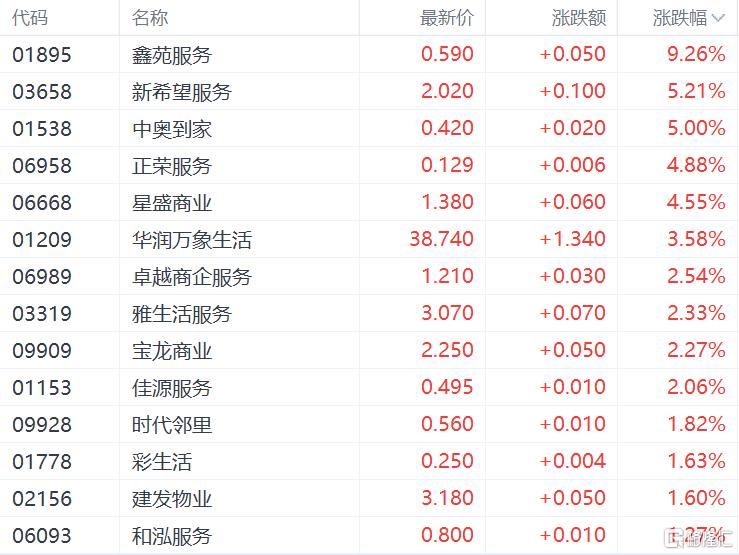 内管股中,鑫苑服务涨超9%,新希望服务、中奥到家涨超5%,正荣服务、星盛商业涨超4%,华润万象生活、卓越商企服务、雅生活服务、宝龙商业跟涨。