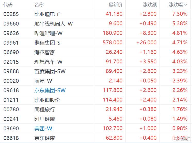 大型科技股普遍呈现上涨行情,百度涨超3%,京东涨超2%,美团、腾讯小幅上涨。