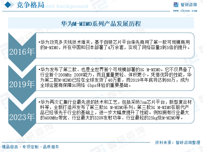 华为技术有限公司是全球领先的信息与通信技术(ICT)解决方案供应商。主要包括运营商网络 、企业解决方案、华为终端、手机、华为云、汽车终端、互联网、支付等多个业务。在MIMO天线方面,公司长期以来坚定投入,积累了深厚的软硬件先进技术,率先在2016年攻克多天线技术难关,基于自研芯片平台率先商用了第一款可规模商用的M-MIMO,并在中国和日本部署了4万余套,实现了网络容量3到5倍的提升。2019年,华为发布了第二款、也是全世界首个可规模部署的5G M-MIMO。它不仅具备了行业首个200MHz 200W能力,而且重量更轻、体积更小。2023年,华为再次汇集行业最先进的技术和工艺,包括采纳7nm芯片平台,新型复合材料等,全新打造并发布了第三款5G M-MIMO系列。第三款5G M-MIMO在前代产品已经领先于行业的基础上,进一步大幅度提升了性能。