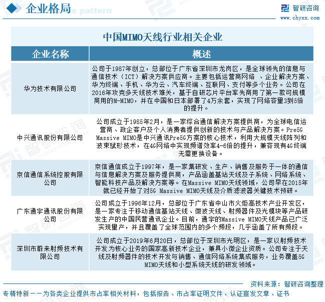 从竞争格局来看,国际巨头凭借丰富的产品线和先进的技术,在MIMO天线中占据领先地位。而国内企业通过不断加强研发投入,近几年也实现了快速崛起。目前,行业内相关企业主要包括华为技术有限公司、中兴通讯股份有限公司、京信通信系统控股有限公司、广东通宇通讯股份有限公司、深圳市蔚来射频技术有限公司等。