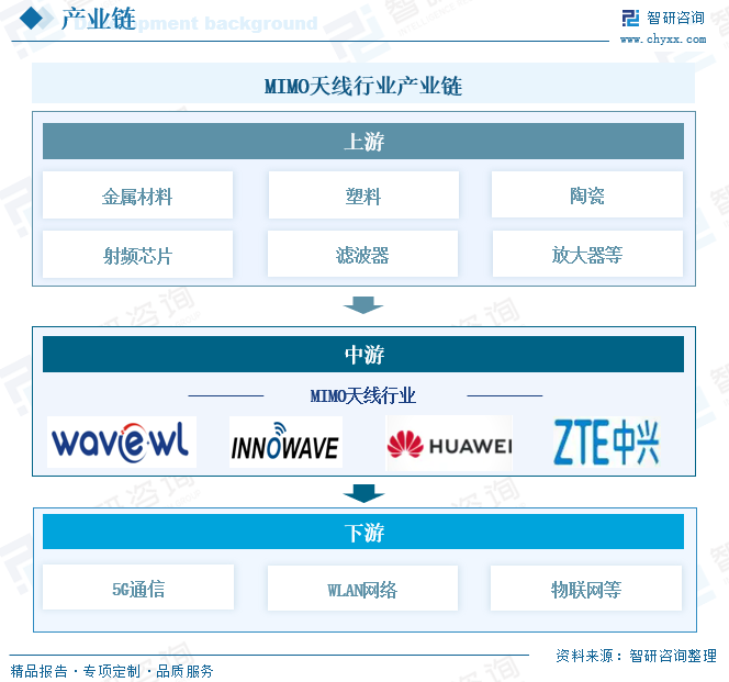 从产业链来看,MIMO天线行业上游原材料主要包括金属材料、塑料、陶瓷等;元器件包括射频芯片、滤波器、放大器等。下游是指MIMO 天线的主要应用领域,包括5G通信、WLAN网络、物联网等,其中在5G通信中,MIMO技术通过多个天线同时发送和接收信号,提高系统容量和频谱效率,实现高速数据传输和低延迟通信。在WLAN网络中,Wi-Fi路由器和设备中也常使用MIMO技术,提供更快速、稳定的无线网络连接。在物联网中,MIMO技术可以提高物联网设备之间的通信效率和可靠性,实现更智能、互连的物联网生态系统。