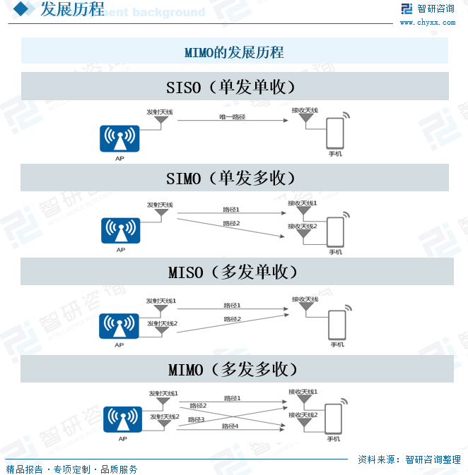 MIMO的前身SISO,即单发单收系统。这种系统发射与接收天线间的路径是唯一的,仅传输1路信号,且每路信号被定义为1个空间流。然而,随着无线通信技术的飞速发展,MIMO技术已逐渐取代SISO,成为行业新的发展方向。而在此过程中,研究者们在终端处增设了额外的天线,从而使得接收端能够同时捕捉到两路信号。这种升级后的传输模式,即单发多收,被命名为SIMO。若进一步增加发射天线的数量,而接收天线保持单一,则称为MISO。这些技术的结合和发展为最终的MIMO技术奠定了基础。