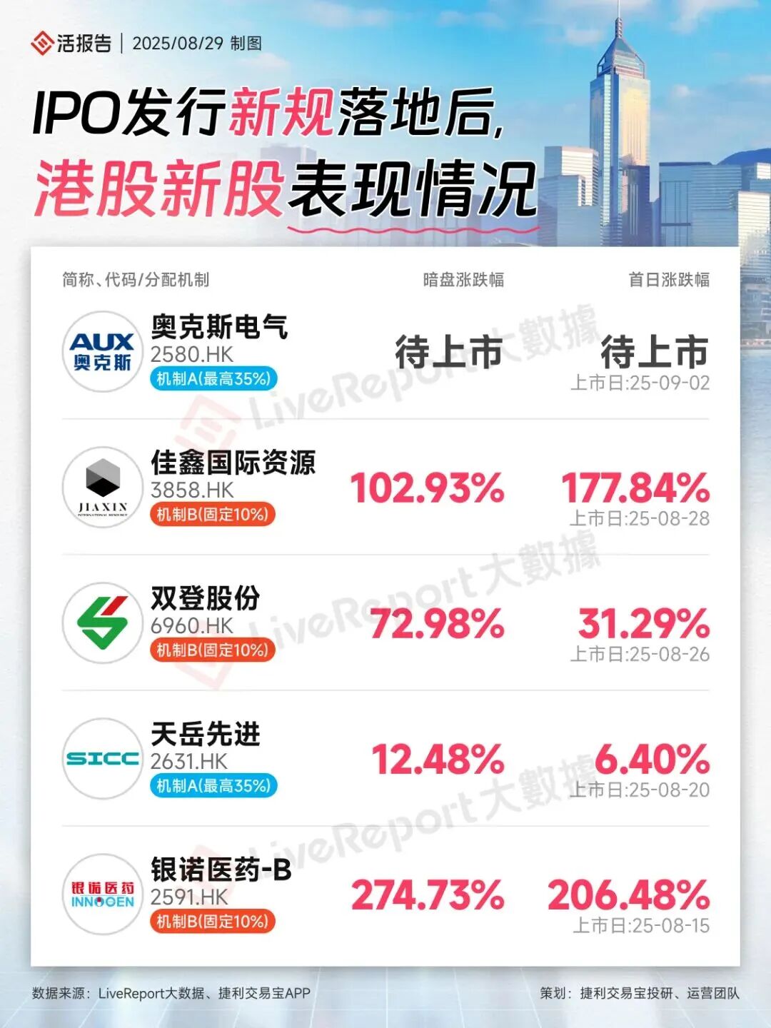 奥克斯电气、佳鑫国际资源完成招股,其中奥克斯电气发行采用机制A,公开初始5%,最高可回拨至35%。截至8月28日17:30,奥克斯电气孖展金额达823亿,孖展认购倍数达456倍。据市场消息,奥克斯电气已将其香港 IPO 定价为招股价区间的上限,并计划全部行使发行规模调整选择权,募集资金41.5亿港元。