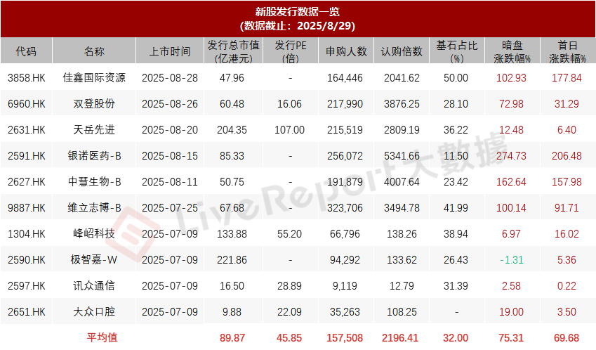 据LiveReport大数据,近10家上市新股平均发行市值为89.87亿,最大市值为极智嘉-W,最小市值为大众口腔;平均发行PE为45.85倍,PE处于中高位水平;平均申购人数为157,508人,平均认购倍数为2,196.41倍;平均基石占比为32.00%,基石平均比例略有下降;