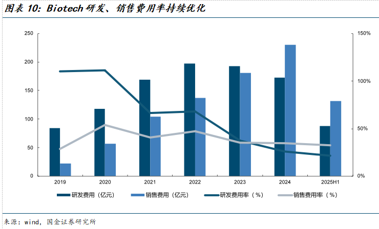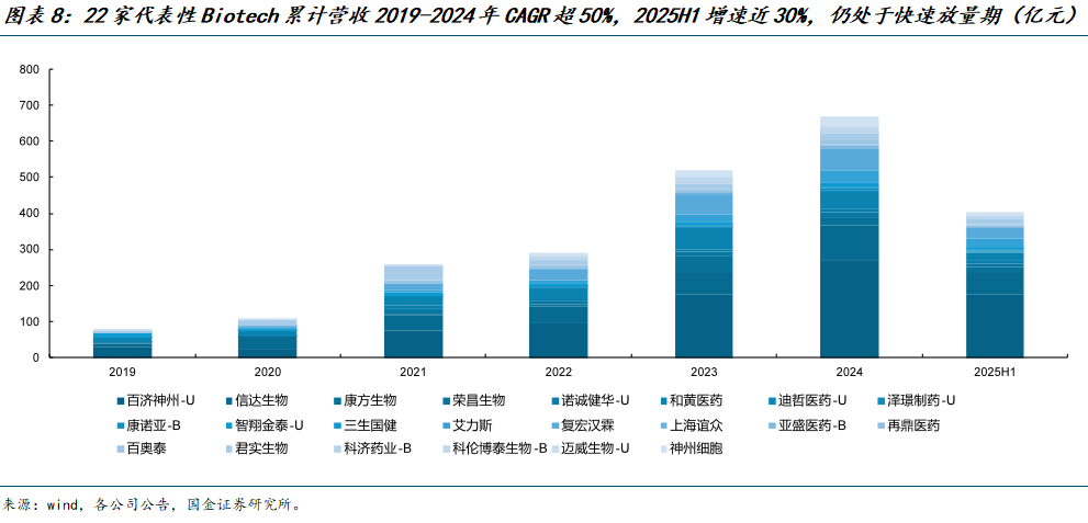 Biotech公司仍处快速放量期,22家代表性Biotech 2025H1累计营收(含里程碑收入)同比增速仍近30%:22家代表性Biotech累计营收从2019年的77亿元快速增长至2024年的668亿元,年复合增速达54%,2025年上半年收入389亿元,在基数体量相对较大的基础上累计收入同比增长29%,仍处于快速放量阶段。剔除里程碑收入,累计营收从2019年72亿元快速增长至2024年的640亿元,年复合增速达55%,2025年上半年同比增速达39%。Biotech仍处于快速放量期。