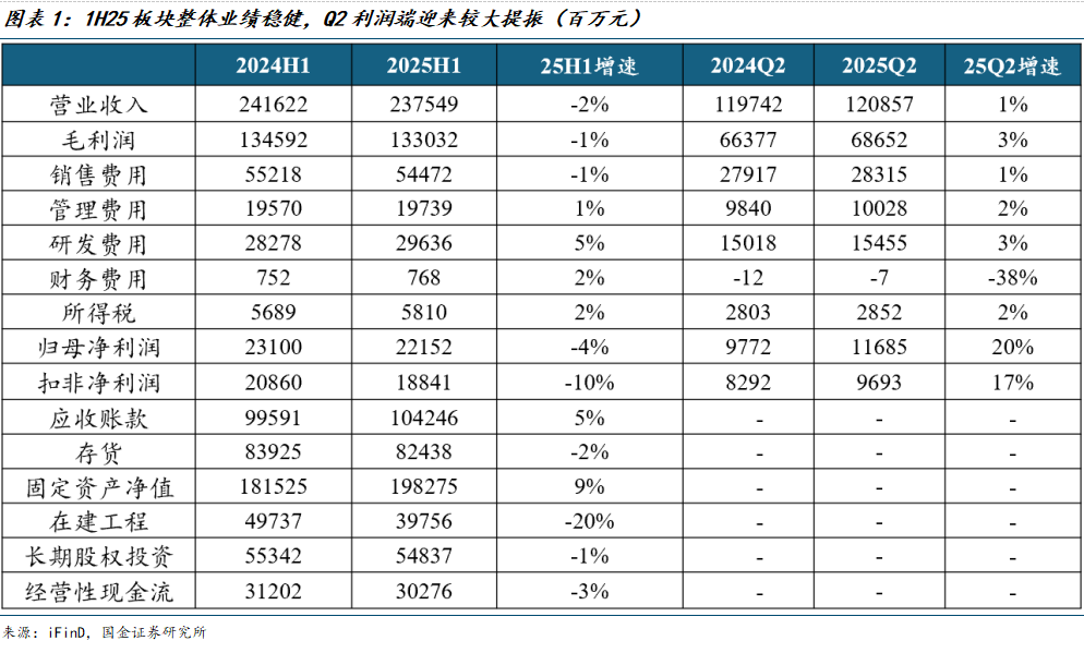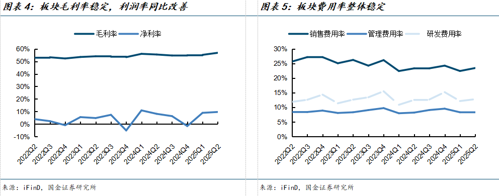药品板块:整体业绩稳健,增长动能从仿制药向创新药切换。药品板块企业(据申万行业分类共选取132家样本企业)2025上半年整体营业收入/归母净利润增速为-2%/-4%,整体业绩稳健;2025Q2营业收入/归母净利润增速为+1%/+20%,板块利润端得益于创新药License out出海、企业运营增效等因素,迎来较大提振。板块销售费用率/管理费用于2025H1增速分别为-1%/+1%,2025Q2增速分别为+1%/+1%,运营费用整体平稳;研发费用于2025H1、2025Q2增速分别为+5%、+3%,增速高于收入增速,创新研发投入力度持续提高。