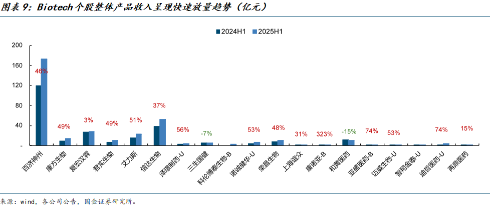 多因素催化Biotech公司核心大单品及整体收入快速提升。以2025H1同比增速较高的几家biotech为例,我们认为产品收入快速放量得益于以下几点催化:①出海:百济神州25H1产品收入173.6亿元,其中百悦泽收入125.3亿元,而其在美国销售额89.6亿元(+52%)、欧洲销售额19.2亿元(+81%),海外的强劲增长拉动业绩快速放量。②疗效优势及支付端倾斜:艾力斯的第三代EGFR- TKI伏美替尼较一代吉非替尼显著延长NSCLC患者PFS,进入医保后快速放量,2025H1快速放量拉动业绩增长,总产品收入增速达51%。③独家适应症:诺诚健华核心产品奥布替尼作为国内首个且唯一获批针对复发或难治性MZL适应症的BTK抑制剂,25H1收入6.39亿元(+53%),独家产品优势明显。当前,国内创新药企临床管线全球竞争力持续提升、医保政策及商保对创新药加速倾斜,国内多家创新药企有望持续步入业绩收获期。
