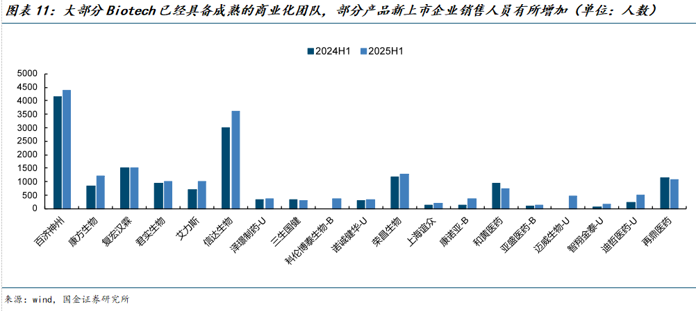商业化效率持续提升,费用率优化趋势明显。随着国内Biotech多款产品上市,头部、产品上市时间相对较早的Biotech已具备相对成熟的商业化团队,销售费用率一方面随着营收增加而下滑,另一方面也得益于商业化能力的成熟,整体费用率持续优化。此外,销售人员除了少数近期产品新上市的企业外,整体变动幅度也相对平缓。人均单产持续提升,多家企业销售人均单产已超300万/人·年。随着商业化能力的持续提升、人均单产持续增加,有望助力Biotech企业增厚利润、加速扭亏为盈。