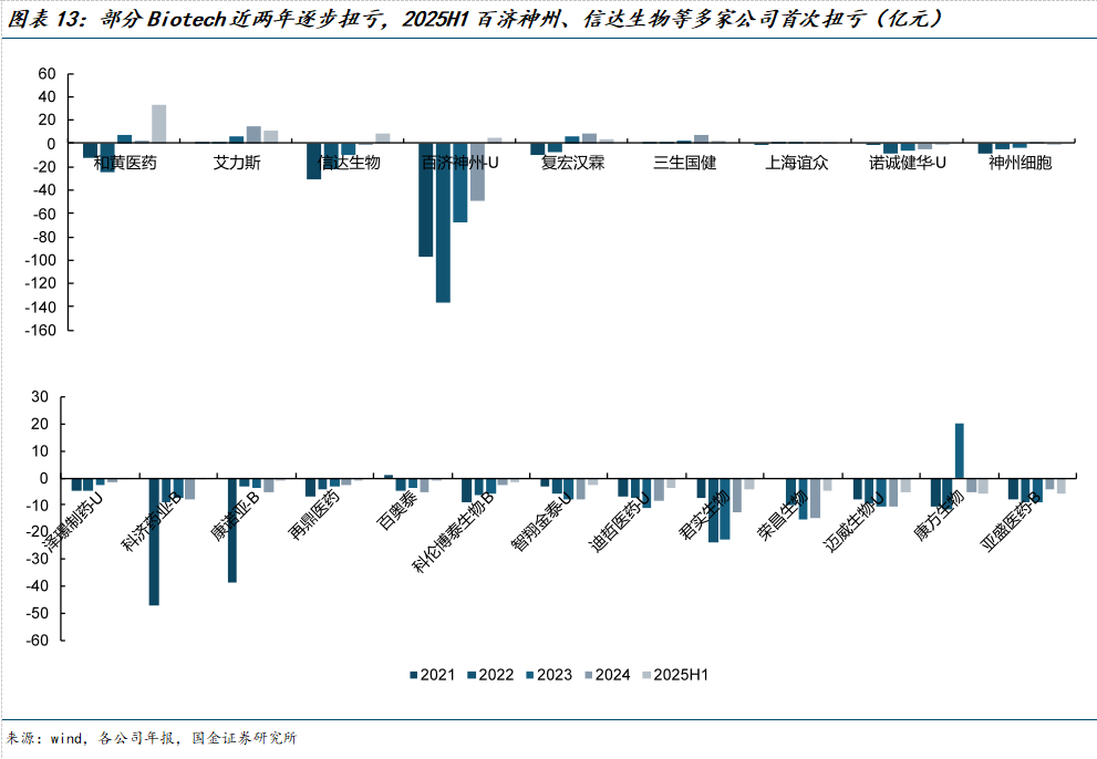 得益于产品快速放量和商业化团队的逐步成熟,扭亏为盈节点渐近。当前,大部分Biotech仍处于尚未盈利阶段,2025H1百济神州、信达生物已实现扭亏为盈,主要得益于产品的快速放量以及研发和销售费用投入效率提升、持续优化。近几年诺诚健华、泽璟制药等多家Biotech企业亏损持续缩窄,预计未来三年内多家企业有望实现扭亏为盈。