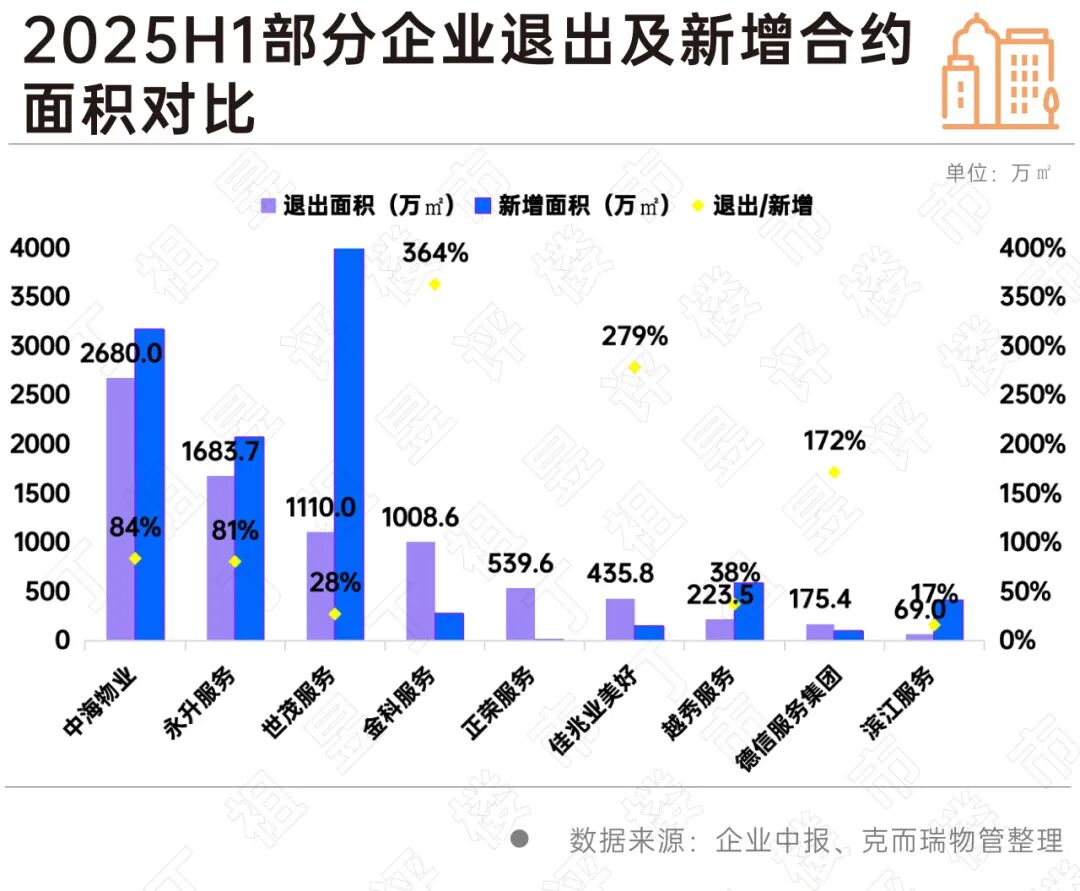2025年上半年,部分上市物企“边拓边退”,调整业务布局。如中海退出住宅合约面积最高,达2680万平方米,同时新增面积3180万平方米,退出面积约为新增面积的84%。还有金科服务为例,上半年退出住宅合约面积1008.6万平方米,新增仅277.3万平方米,退出面积是新增面积的3.6倍。