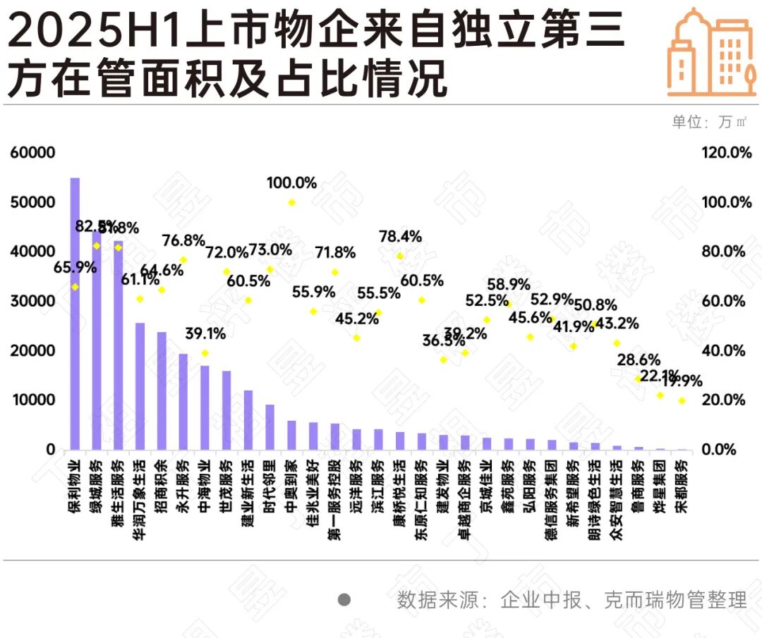 从市场拓展来看,尽管企业加大了第三方项目拓展力度,但受持续退出项目影响,2025年上半年第三方在管面积占比有所下滑。在披露完整数据的29家上市物企中,来自独立第三方的在管面积占比约为65.0%,较去年同期下降0.4个百分点。