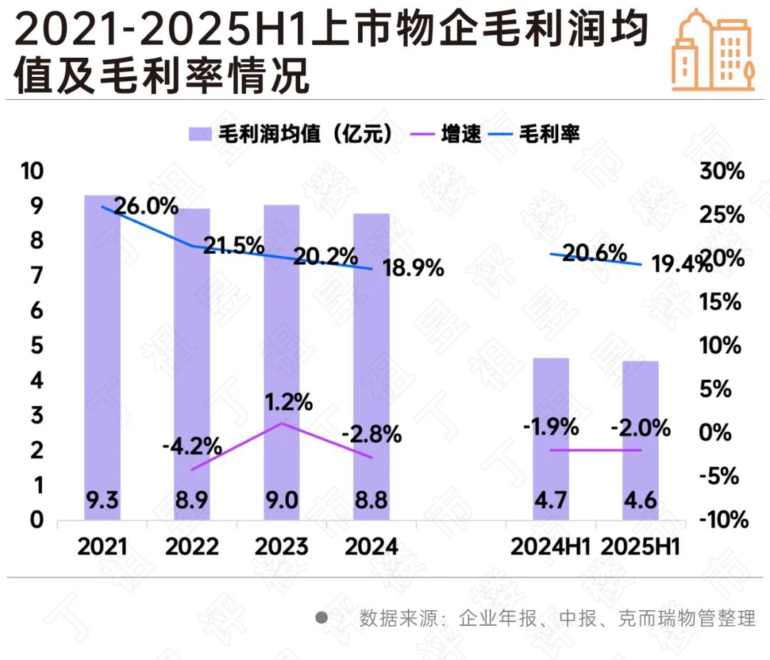 2025年上半年,63家上市物企毛利润均值为4.6亿元,同比下降2.0%。受外部环境持续承压影响,居民对物业费降价诉求强烈,叠加人力成本持续上涨,企业盈利能力承压,毛利率同比下降1.2个百分点,降至19.4%。