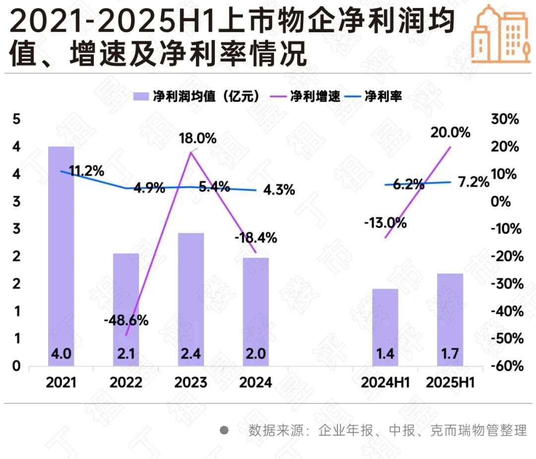 2025年上半年,63家上市物企净利润均值达1.7亿元,同比增长20%。随着企业资产减值影响逐步减弱,净利率同比提升1.0个百分点,升至7.2%。