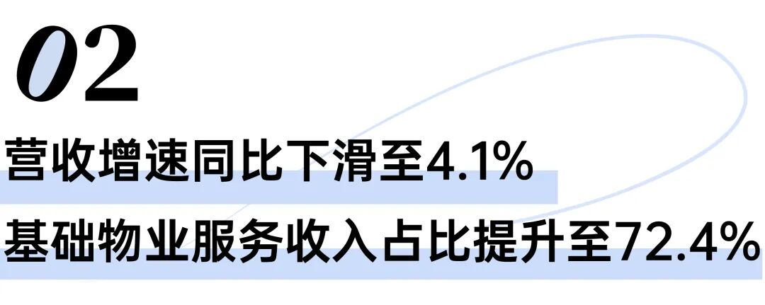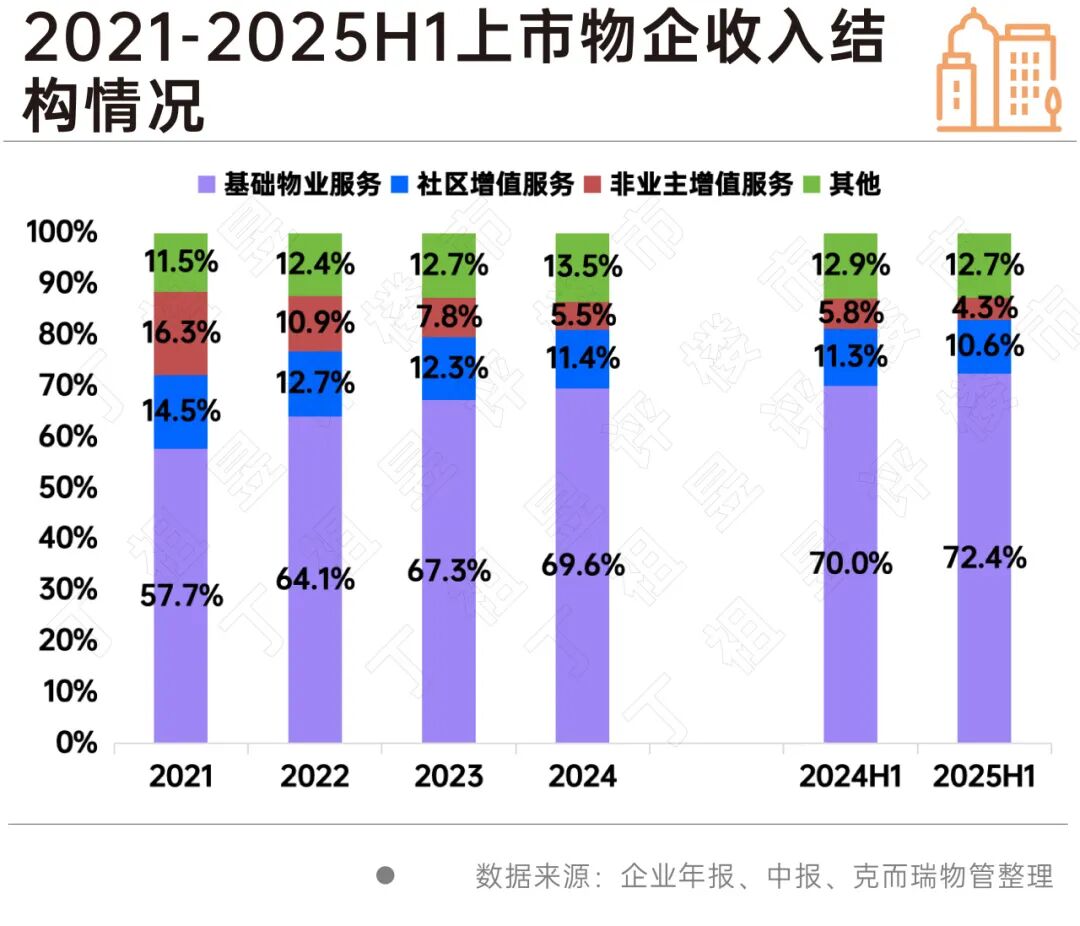在41家连续披露数据的企业中,基础物业服务、社区增值服务和非业主增值服务的收入占比分别为72.4%、10.6%和4.3%。其中,基础物业服务收入占比较去年同期提升2.4个百分点,社区增值服务和非业主增值服务占比则分别下降0.7个百分点和1.5个百分点,基础物业服务的主业地位进一步凸显。