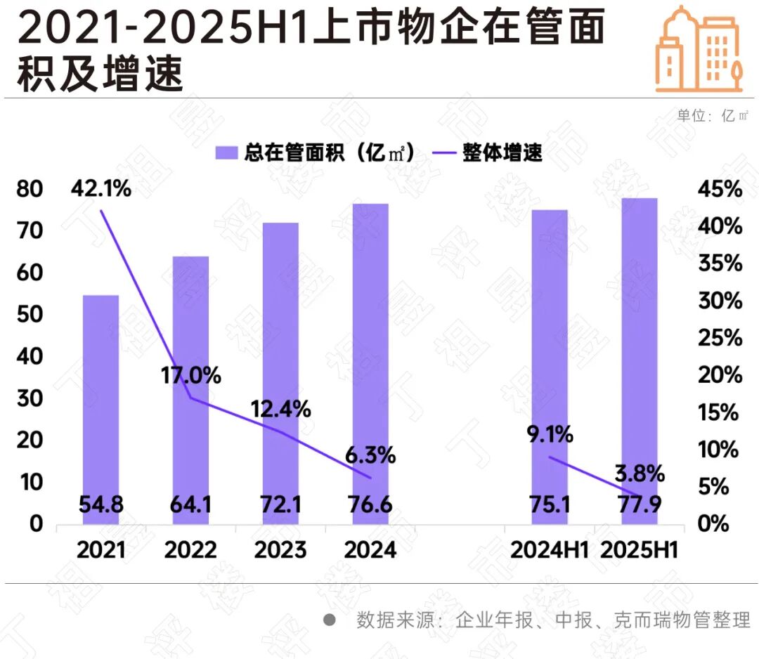 截至目前,除2家企业中报延期外,63家上市物企2025年中期业绩已全部发布,2025年上半年,披露在管面积的53家上市物企总在管面积约77.9亿平方米,同比增长3.8%,增速较去年同期下滑5.3个百分点。
