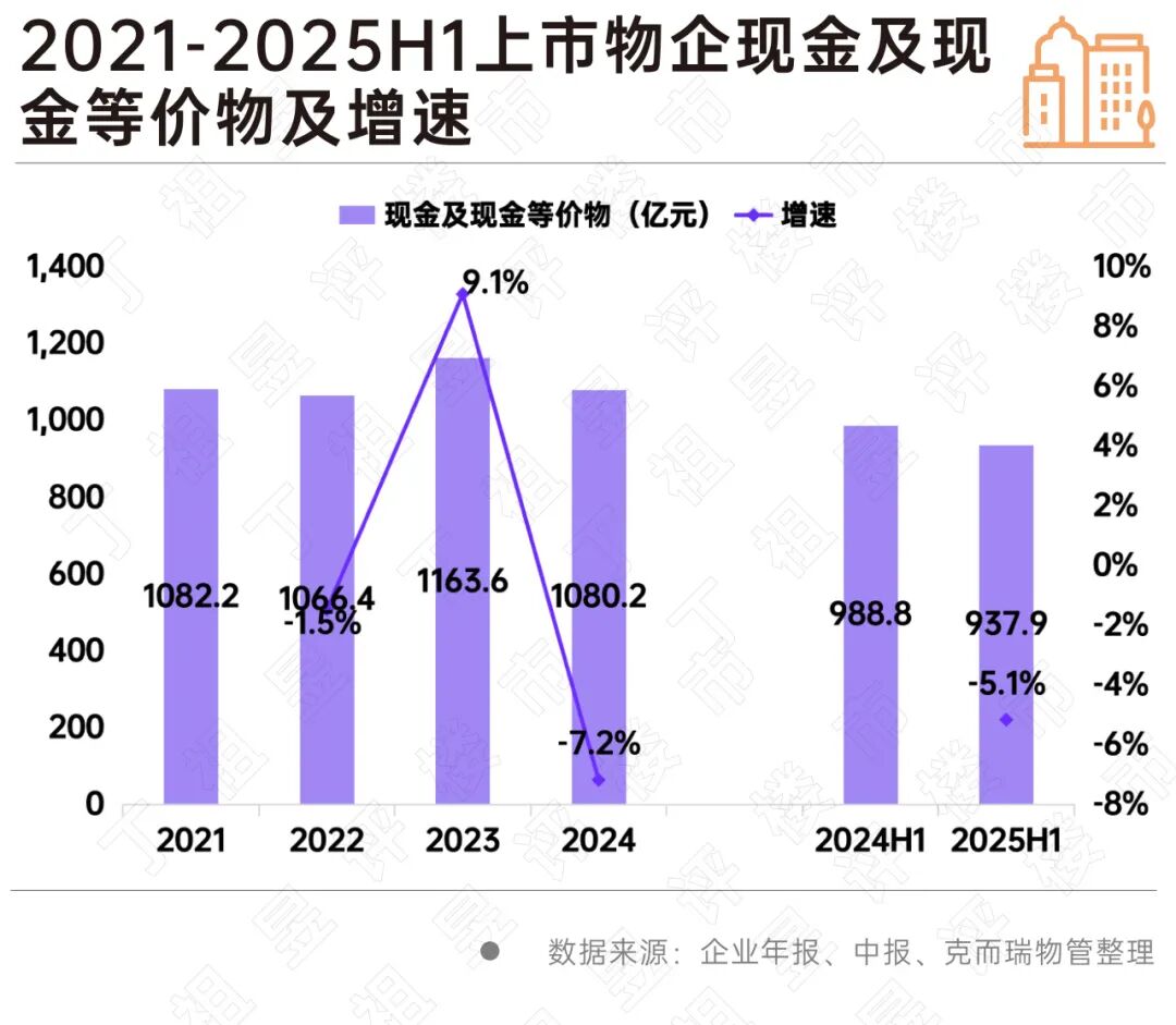 从现金流表现来看,2025年上半年,63家上市物企现金及现金等价物总额降至937.9亿元,同比下降5.1%,延续了2024年以来的下滑趋势,行业整体现金流压力依然显著。