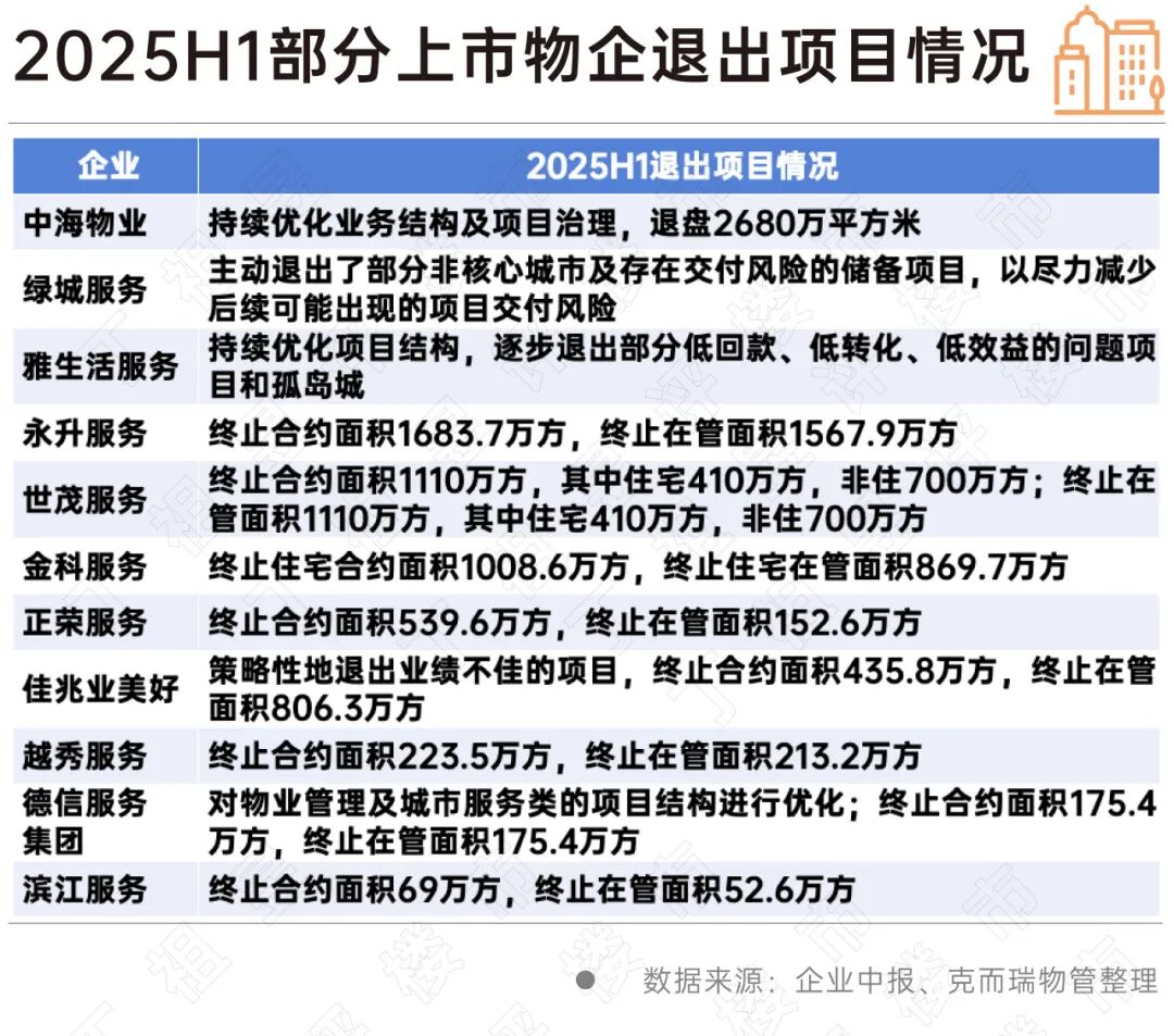 2025年至今,物企主动退出项目管理的情况呈现常态化。包括中海物业、滨江服务、龙湖物业、金科服务在内的品牌物企亦在持续承压下主动放弃部分在管项目。其中,中海物业退盘面积达到2680万平方米,永升服务、世茂服务、金科服务等企业退出项目也超过千万平方米。