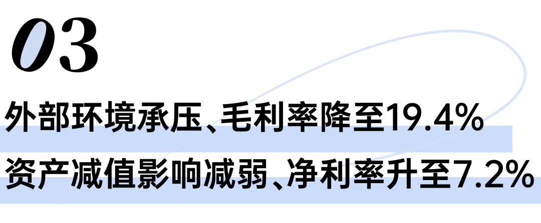 受外部环境持续承压影响,企业盈利能力承压,毛利率同比下降1.2个百分点,降至19.4%。同时,随着企业资产减值影响逐步减弱,净利率同比提升1.0个百分点,升至7.2%。