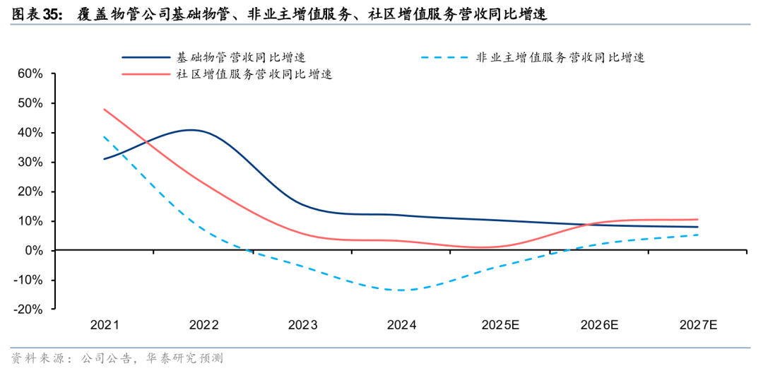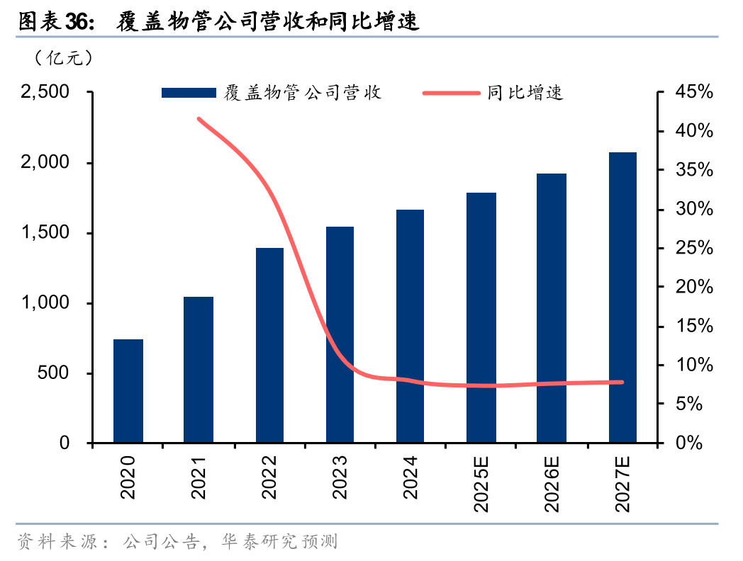 往前看,我们依然看好高股息、地产拖累减弱、消费回暖三大逻辑的持续演绎。尽管物管行业仍在面临物业费降价和收缴压力、市拓竞争等挑战,但我们认为一方面这些因素或已被充分定价,年初至今(9月5日)我们覆盖的物管公司股价上涨23%,仅略低于恒生指数(上涨27%);另一方面,头部公司有望凭借综合实力和服务品质优势,展现更具韧性的经营表现。我们预计25-27年覆盖物管公司基础物管、非业主增值服务、社区增值服务营收增速分别为10%/8%/8%、-6%/2%/5%、1%/9%/10%,对应总体营收增速为7%/8%/8%,核心/归母净利润增速为6%/10%/10%,25年总体派息率有望同比+5pct至71%。
