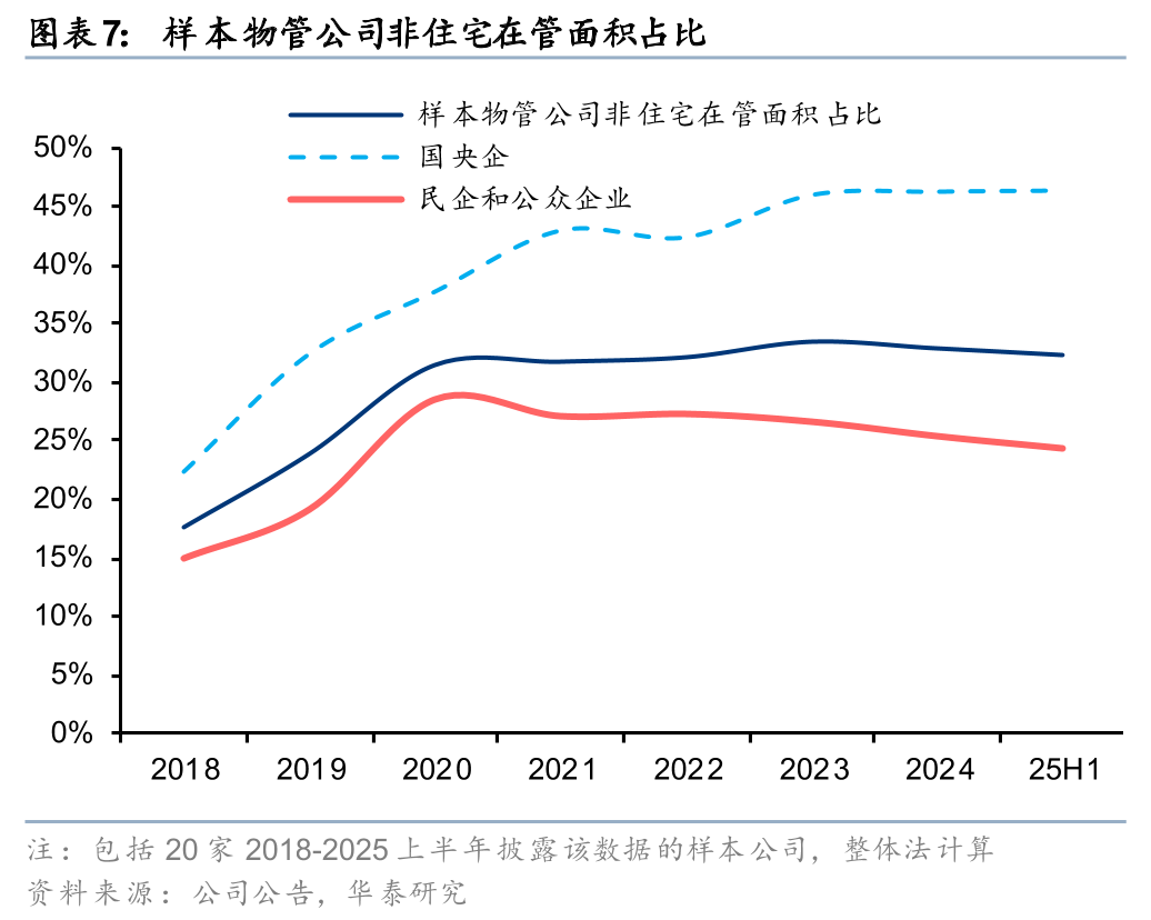 25H1样本物管公司非住宅在管面积占比为32%,较24年末-1pct。其中,国央企、民企物管公司非住宅在管面积占比分别为46%、24%,较24年末持平、-1pct。21年以来样本物管公司非住宅在管面积占比保持稳定,但国央企和民企存在分化。国央企占比稳中有进,而民企逐步收缩,体现了国央企在非住宅拓展方面的禀赋优势。尽管非住宅项目拓展流程短、容易起量,但续约不确定性相对更大,部分业态或部分区域的项目受经济环境影响亦存在回款压力,部分民企选择将市拓重心回归更加稳定的住宅项目,非住宅只聚焦部分盈利能力更强的重点业态(例如商写、产业园等),不再“全面出击”。