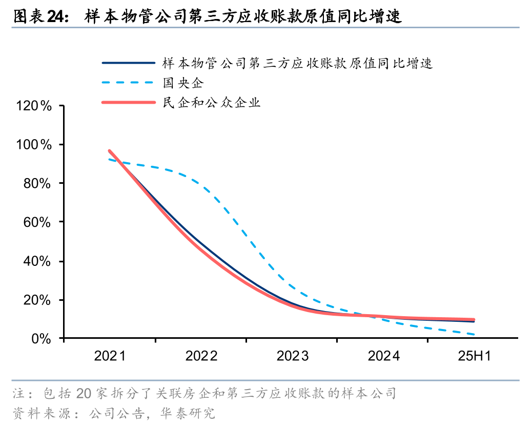 而在第三方应收账款方面,24年以来受经济环境、部分城市出台物业费限价政策、新房交付质量不佳等因素的影响,物管行业在C端、B端和G端均面临更大的收缴压力。但物管公司普遍通过提升服务品质、加强收缴管理、鼓励物业费预缴、退出收缴率低的项目等手段强化现金流管控,控制了应收账款的增长速度。25H1样本物管公司第三方应收账款原值同比+8%,国央企、民企物管公司分别同比+2%、+10%,国央企第三方应收账款同比增速已低于营收增速,增量风险实际上已得到有效控制。不过,考虑到第三方应收账款已积累了较大的存量规模,随着账龄逐步增加,我们认为行业减值关注点或将从关联房企应收账款和商誉,逐步向第三方应收账款转移。总体来看,第三方应收账款减值释放节奏或将相对平滑,但不同公司之间可能存在分化(取决于关联房企交付质量、保交付项目占比、历史收入确认的严格程度和服务品质等因素)。