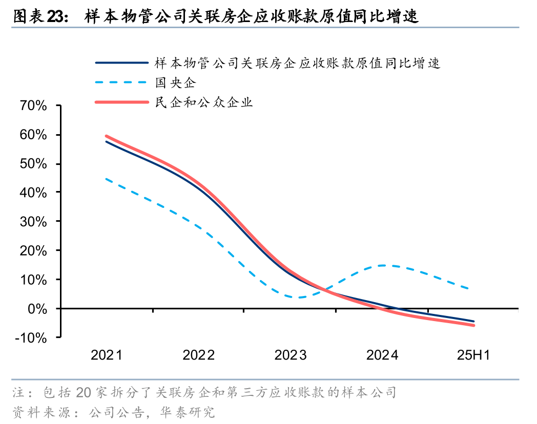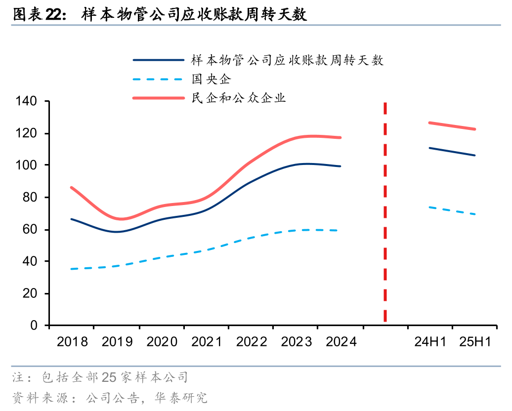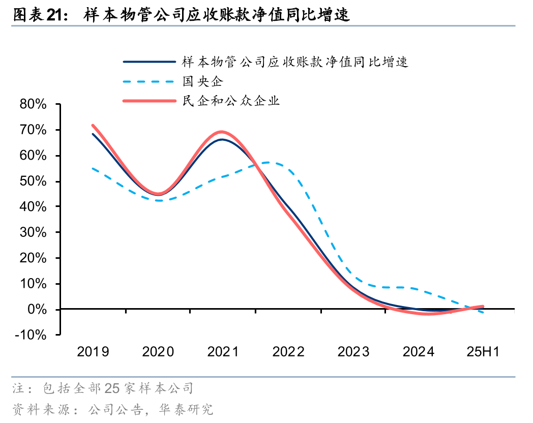 25H1样本物管公司应收账款净值同比增长1%,较24年+1pct,应收账款周转天数较24年末-5天至106天。其中,国央企、民企物管公司应收账款分别同比-1%、+1%,增速较24年-8pct、+3pct,应收账款周转天数分别为69、122天,同比-5、-4天。